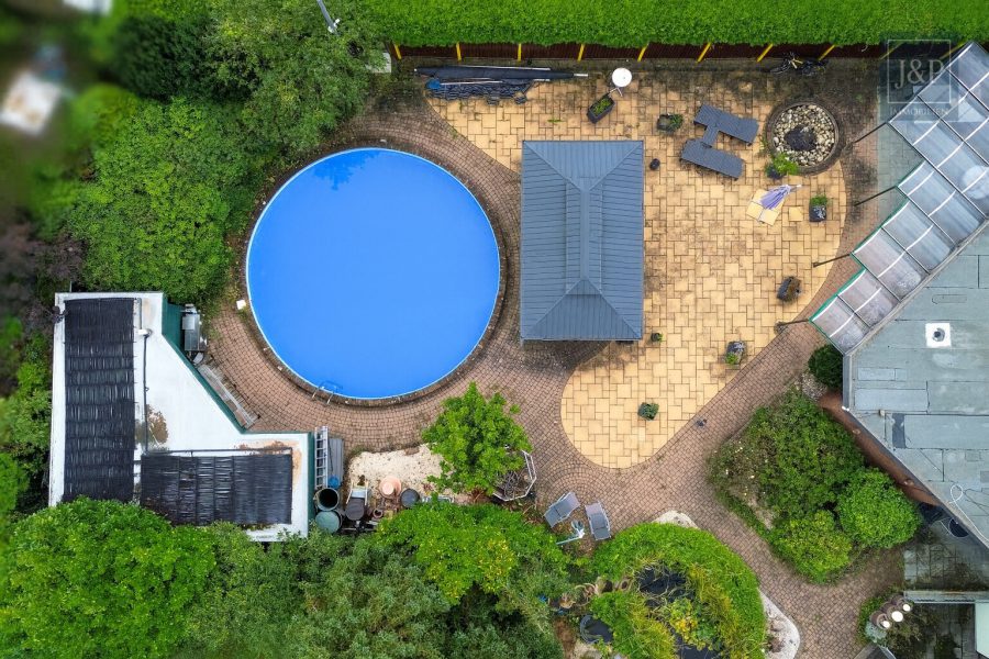 Die großzügige Bauweise ermöglicht ein komfortables, barrierefreies Wohnen. Im gesamten Haus sorgt eine Fußbodenheizung für ein angenehmes Raumklima. Der offen gestaltete Wohnbereich mit großen Fensterfronten schafft eine helle, freundliche Atmosphäre und öffnet sich direkt zur Sonnenterrasse und in den großen Garten. Hier erwarten Sie ein Teich, ein Pool sowie ein liebevoll angelegter Außenbereich – ein Rückzugsort mit hohem Erholungswert.