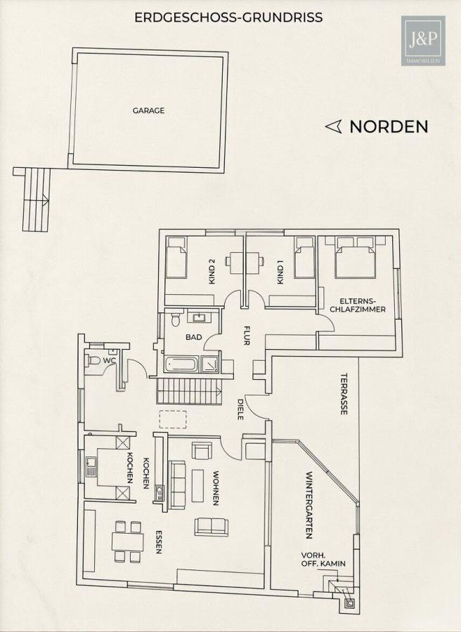 Die Süd-West-Seite des Hauses ist ganz dem geselligen Leben gewidmet: Eine offene Küche und der weitläufige Essbereich gehen fließend in das helle Wohnzimmer über. Ein besonderes Highlight ist der 1990 ergänzte Wintergarten: Mit seinem offenen Kamin verspricht er gemütliche Stunden mit Blick in den Garten. Der private Schlaftrakt auf der Ostseite bietet mit drei Zimmern und einem großen Tageslichtbad Ruhe und Rückzugsmöglichkeiten.