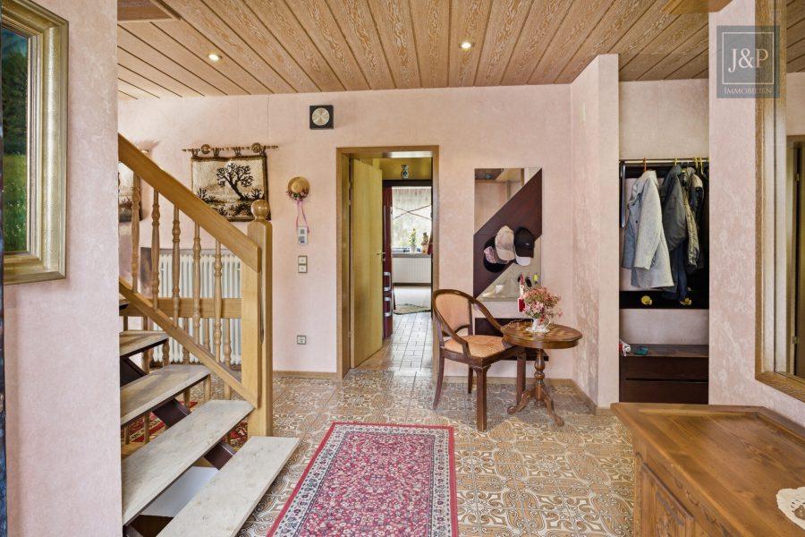 Dieser charmante Bungalow aus den 1970er-Jahren überzeugt durch seine zeitlose Architektur und einen außergewöhnlich großzügigen, offenen Grundriss. Schon beim Betreten empfängt Sie ein lichtdurchfluteter Eingangsbereich, der Weite vermittelt und dennoch praktischen Raum für eine Garderobe bietet. Er fungiert als Herzstück, von dem aus alle Bereiche des Hauses sternförmig erschlossen werden.