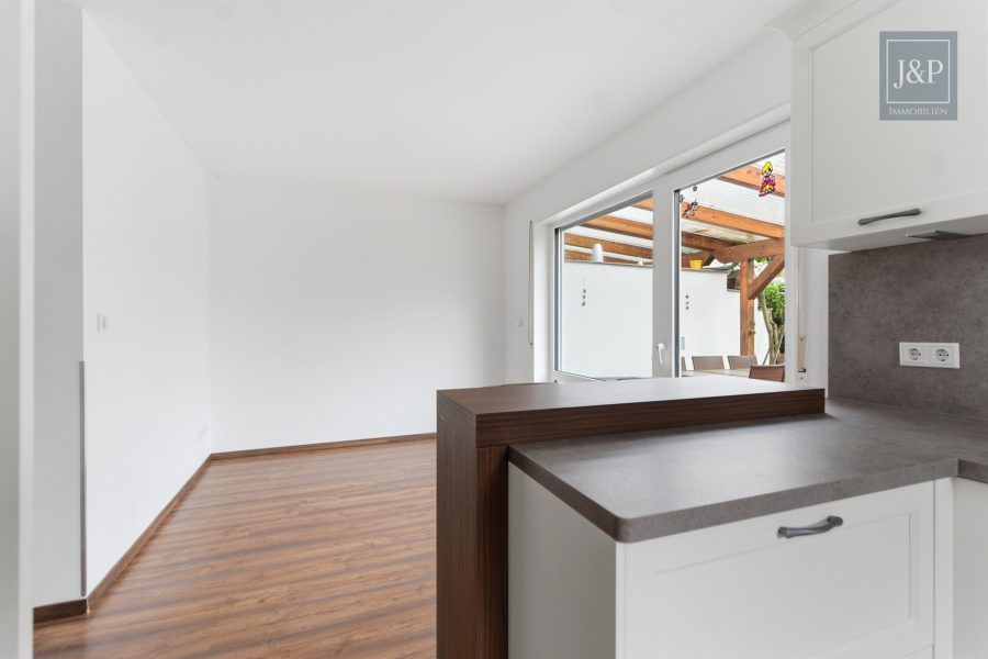 Im Erdgeschoss überzeugt der Grundriss durch eine klare Struktur und helle Räume. Das ca. 25 m² große Wohnzimmer bildet das Herzstück des Hauses und bietet direkten Zugang zur sonnigen Süd-West-Terrasse – perfekt für gesellige Nachmittage oder entspannte Stunden im Freien. Der separate Küchen- und Essbereich mit etwa 20 m² schließt sich an die zweite, nach Nord-Ost ausgerichtete Terrasse an. Hier genießen Sie das Frühstück in der Morgensonne oder eine kühle Brise an warmen Sommertagen. Die moderne Einbauküche fügt sich harmonisch in den Raum ein und überzeugt mit hochwertigen Geräten und einem ansprechenden Design. Ein Gäste-WC ergänzt das Erdgeschoss und unterstreicht die Alltagstauglichkeit der Immobilie.