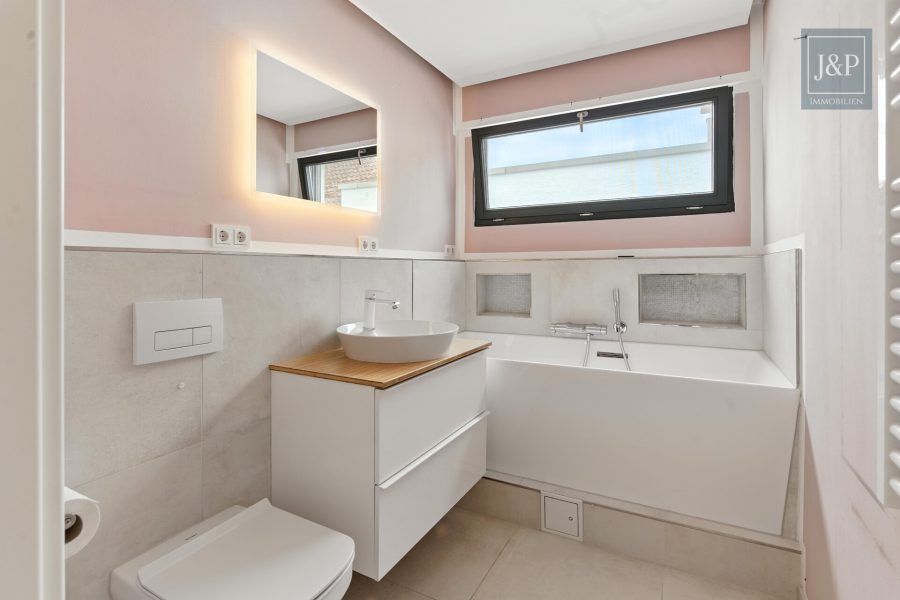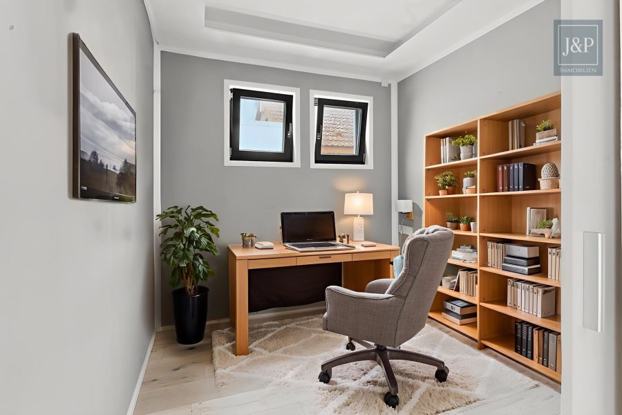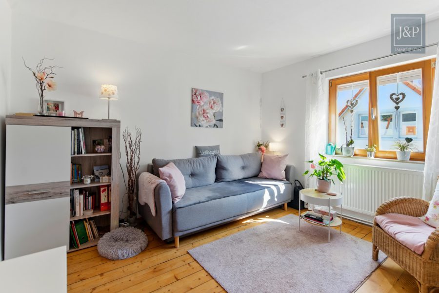 Ein separates Treppenhaus führt Sie in das erste Obergeschoss, in dem sich eine hochwertige Einliegerwohnung (ca. 47qm) befindet. Der edle Dielenboden schafft eine warme und einladende Atmosphäre. Hier erwarten Sie ein Schlafzimmer, ein gemütlicher Wohnbereich, eine geräumige Küche und ein Tageslicht-Badezimmer. Auch in dieser Einheit wird das Tageslicht ideal genutzt und sorgt für eine angenehme Lebensqualität.