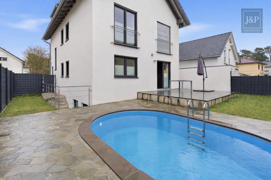 Ein echtes Highlight ist der Außenbereich: Der eigene Garten mit Pool bietet nicht nur Erholung, sondern wird schnell zum Lebensmittelpunkt in den warmen Monaten – ob Kindergeburtstage, Grillabende oder einfach entspannte Sommertage.