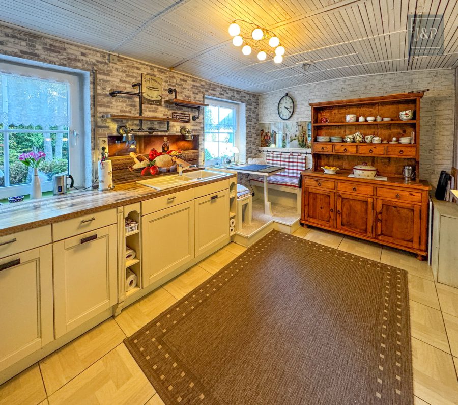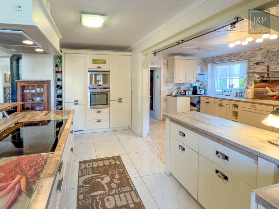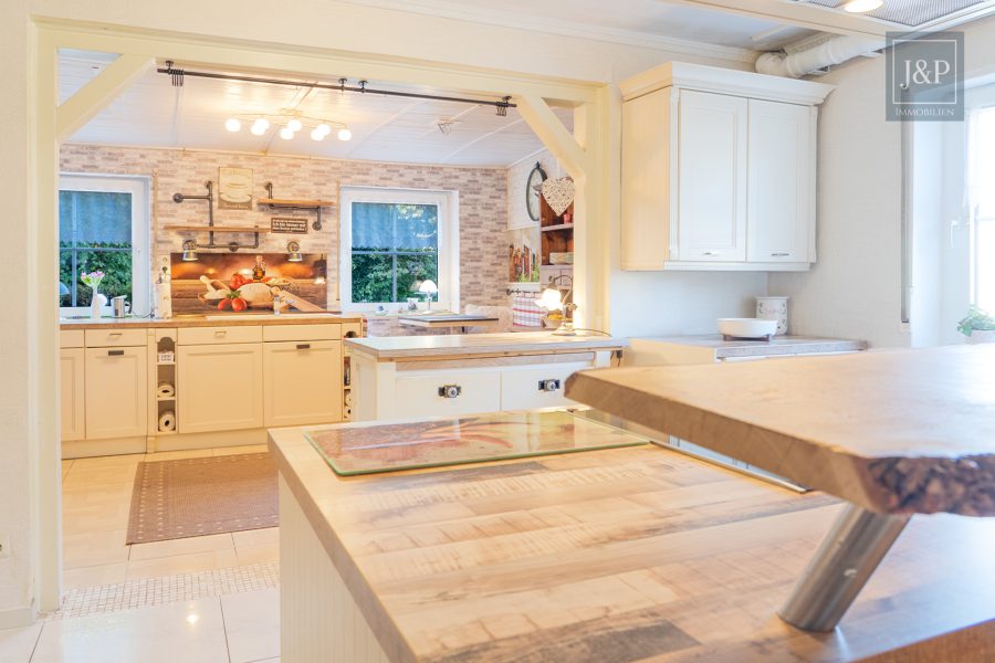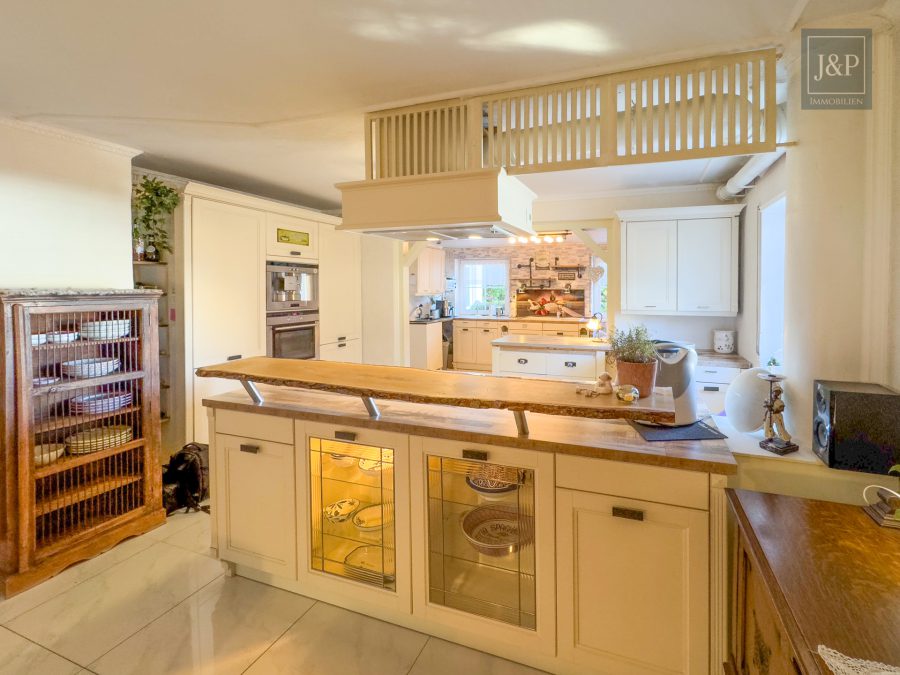 - Großzügige, maßgefertigte Küche mit Echtholztheke und integrierter Sitzecke