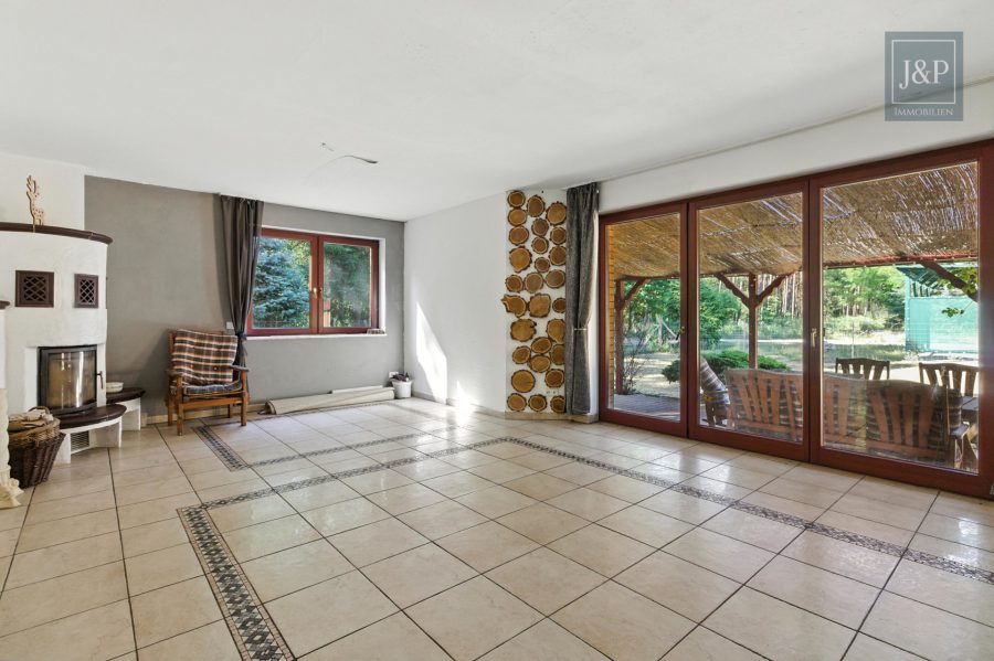 Das Wohnzimmer mit etwa 33 m² Fläche ist besonders großzügig gestaltet und überzeugt durch eine große bodentiefe Fensterfront, die viel Licht hereinlässt und den direkten Zugang zur großen, überdachten Terrasse ermöglicht – perfekt für gemeinsame Familienstunden im Freien. Im Wohnzimmer befindet sich außerdem ein wasserführender Kamin, dieser sorgt im Winter für behagliche Wärme und unterstützt effizient das Heizsystem.