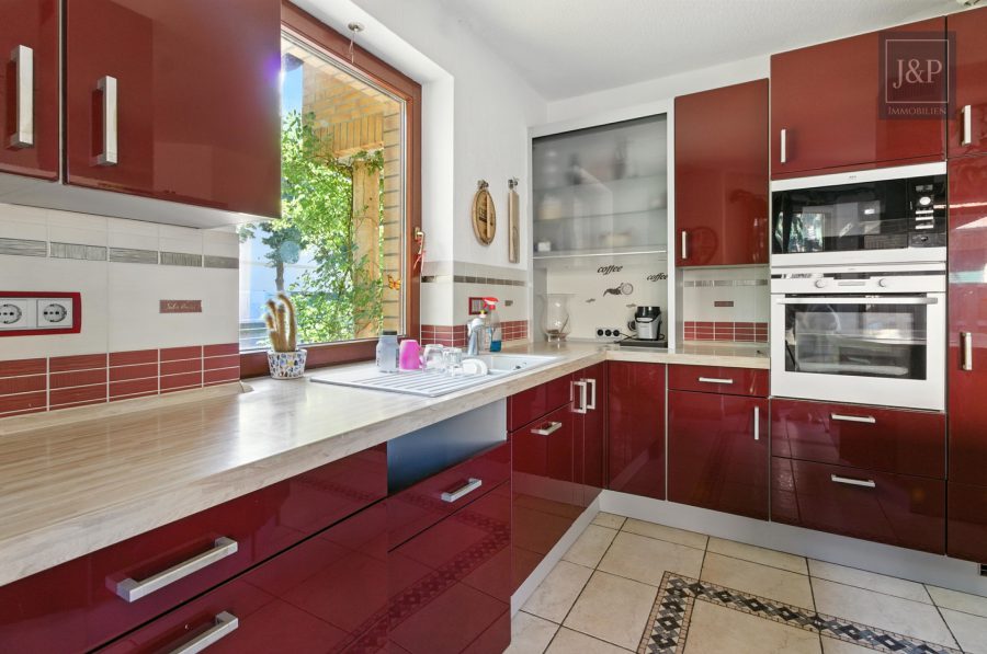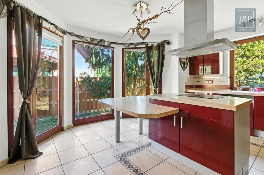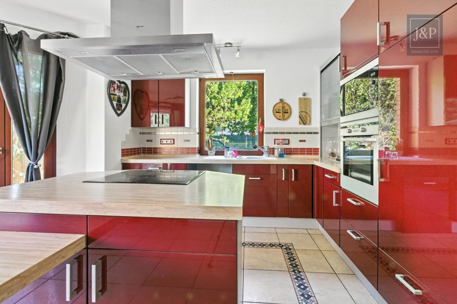 Die moderne Küche ist sehr hell und freundlich gestaltet, ausgestattet mit einer praktischen Kochinsel, die zum gemeinsamen Kochen und Beisammensein einlädt.