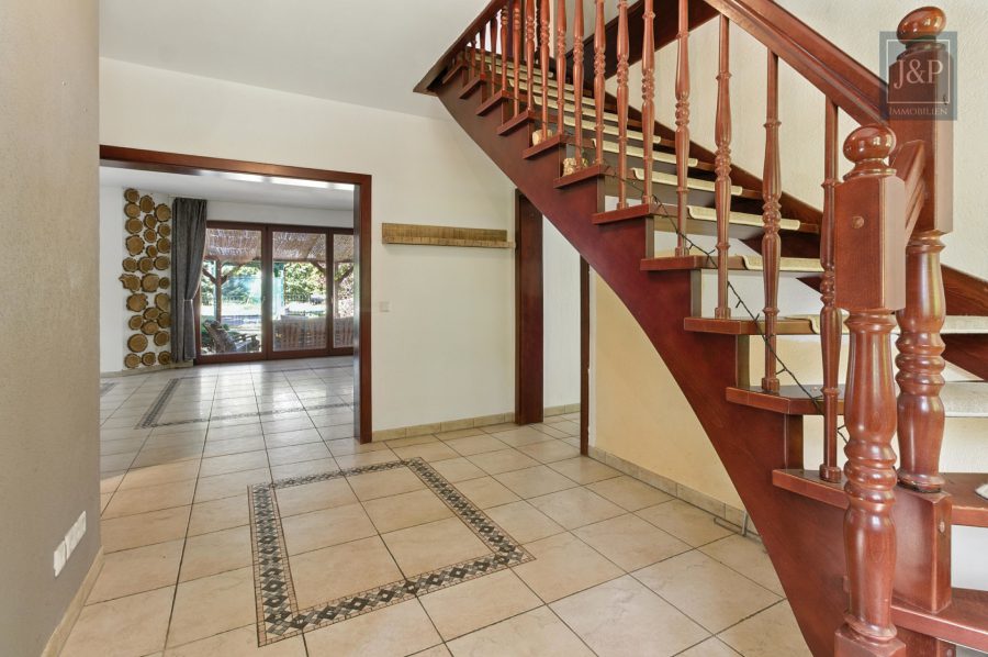 Beim Betreten des Hauses gelangen Sie in einen großen, hell gefliesten Eingangsbereich, von dem alle Zimmer abgehen – darunter das Wohnzimmer, die Küche, der Hauswirtschaftsraum sowie das Gäste-WC.
