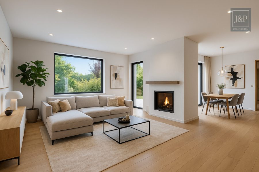 Im Erdgeschoss empfängt Sie ein großzügiger Wohn- und Essbereich mit einem zentralen Kamin, um den man frei herumlaufen kann – ein architektonisches Highlight und Herzstück des Hauses. Von hier gelangen Sie direkt auf die große Terrasse mit Blick in den eingewachsenen Garten. Ein Schlafzimmer mit angrenzendem Bad, die Küche sowie ein weiteres Zimmer, das sich z. B. als Büro eignet, komplettieren diese Ebene.