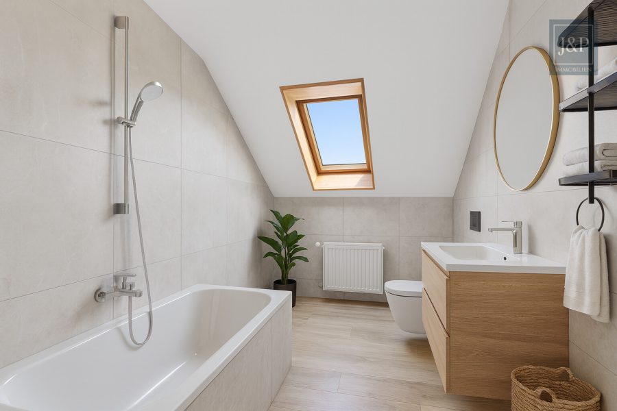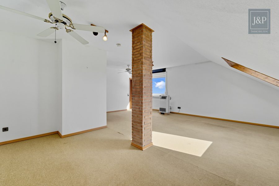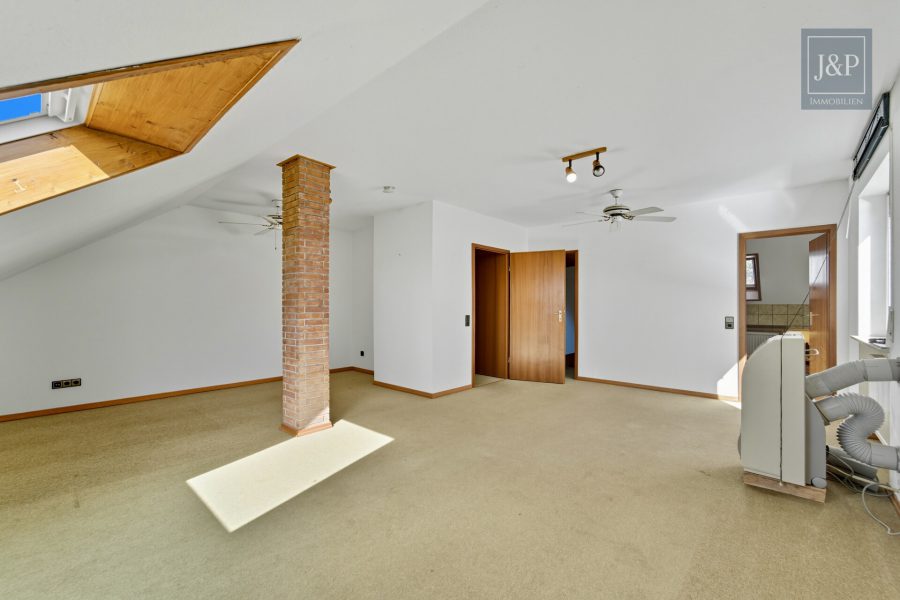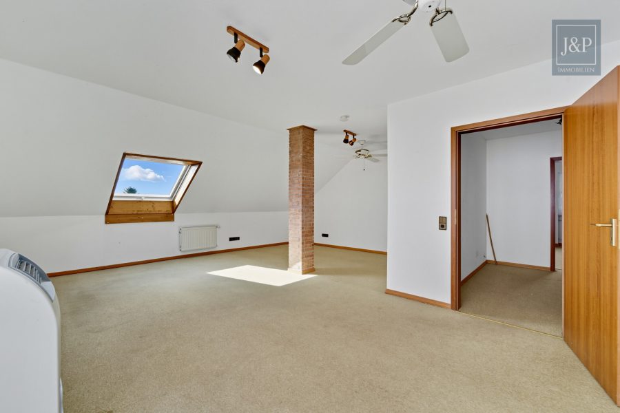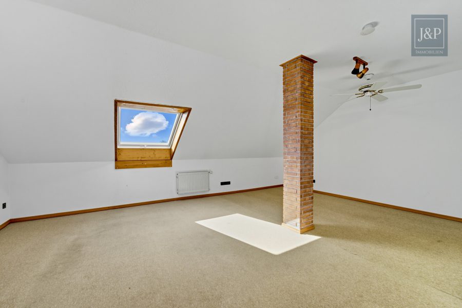 Im Obergeschoss erwarten Sie zwei besonders große Räume, die flexibel in weitere Zimmer aufgeteilt werden können. Hinzu kommen ein Ankleidebereich und ein weiteres Badezimmer.