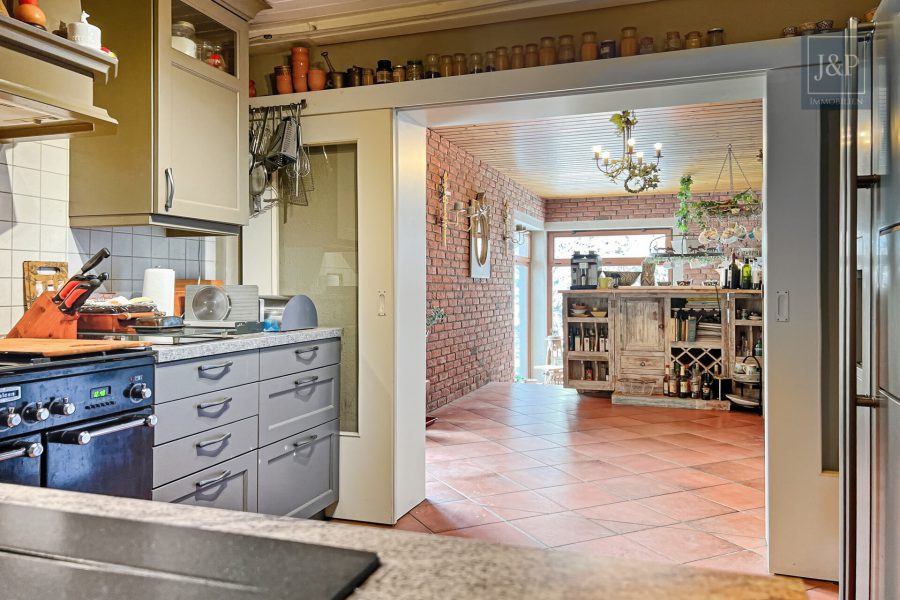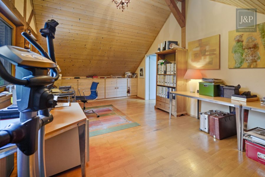 Die ca. 287 m² Wohnfläche, verteilt auf neun Zimmer, eröffnen vielfältige Nutzungsmöglichkeiten – für Familien, Kreative, Homeoffice-Konzepte oder Mehrgenerationenwohnen. Herzstück des Hauses ist der großzügige Wohn- und Essbereich mit Kamin, offen gestaltet und mit direktem Zugang zur Galerie. Große Fensterflächen holen die Natur in die Räume und schaffen eine außergewöhnliche Verbindung zwischen Innen und Außen.