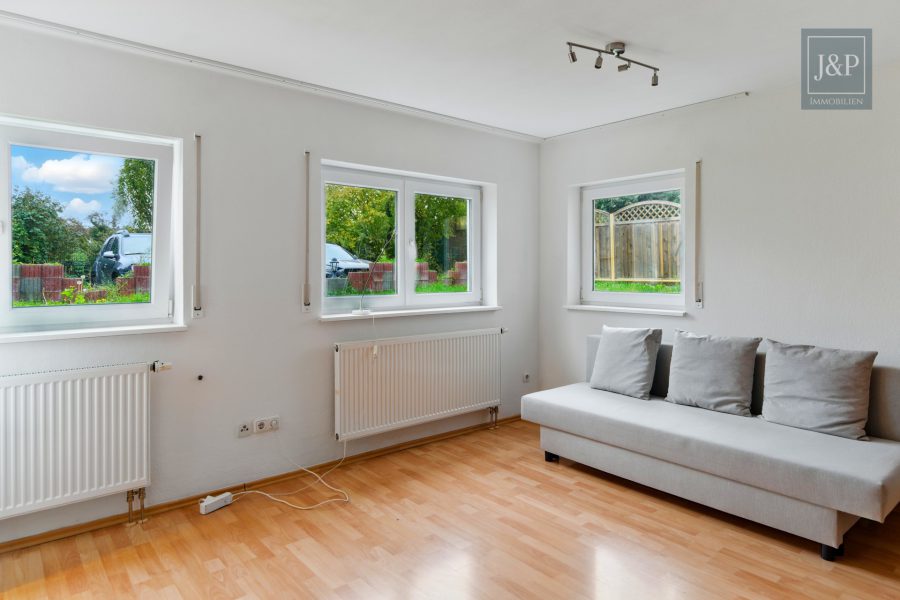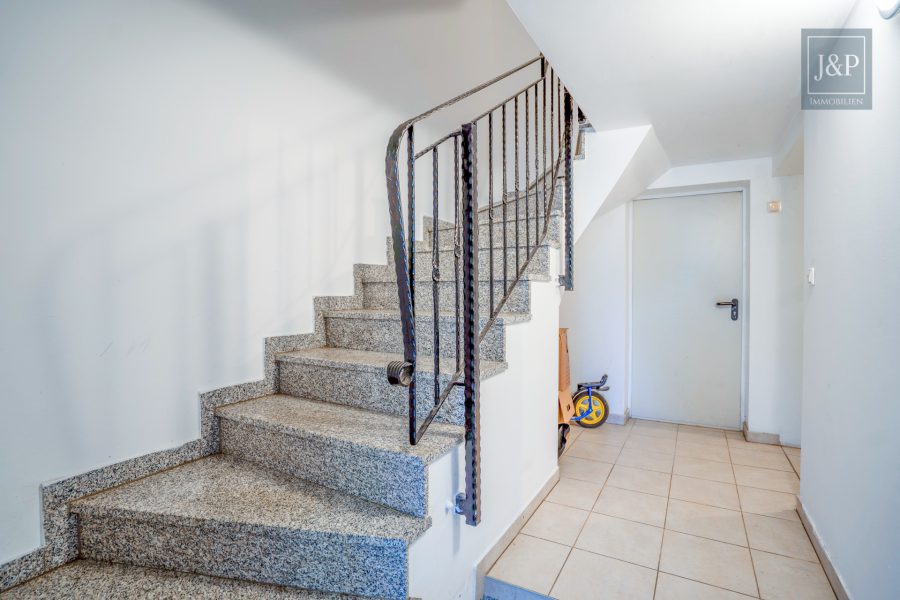 Nach Ihrer Ankunft an der Garage / Stellplatz betreten Sie durch den Garten das Treppenhaus, das einen zusätzlichen Vorraum für Fahrräder bietet. Im Untergeschoss finden Sie neben den Kellerräumen und dem Waschraum eine ca. 30 m² große Einliegerwohnung mit offenem und flexiblem Schnitt. Diese Wohnung verfügt zudem über einen Gartenzugang.