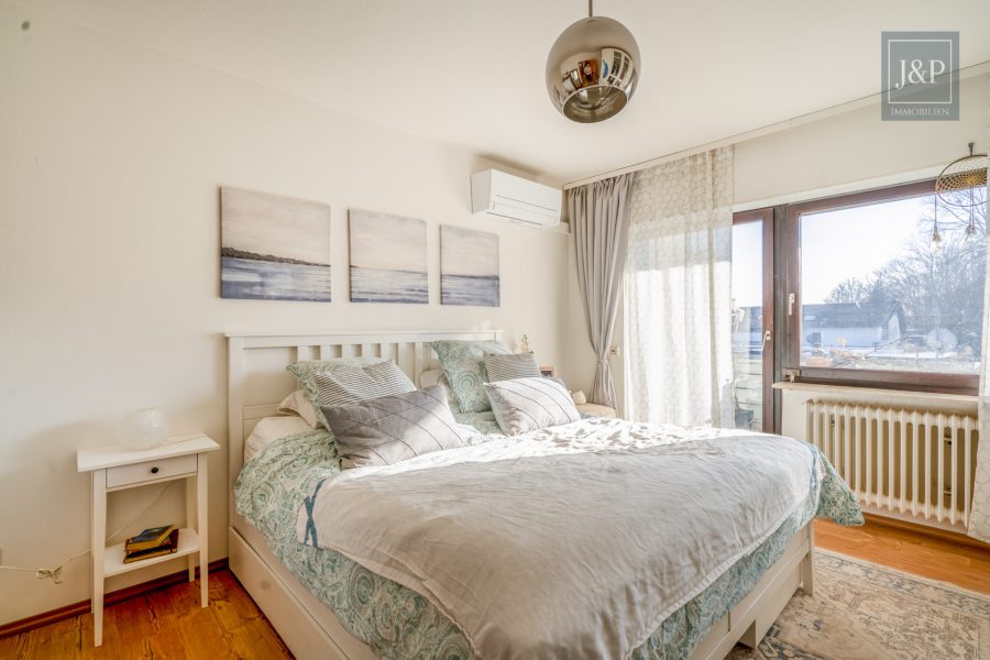 Im Obergeschoss befindet sich der Rückzugsort der Familie. Hier haben alle Familienmitglieder durch drei separate Zimmer zwischen 11 und 15 qm ihren eigenen Bereich zum Ausleben. Zwei der Zimmer haben zusätzlich einen Zugang zu dem Balkon. Ebenfalls auf der Etage befindet sich ein vollwertiges Badezimmer mit Dusche und Badewanne.