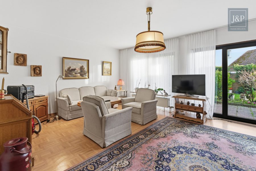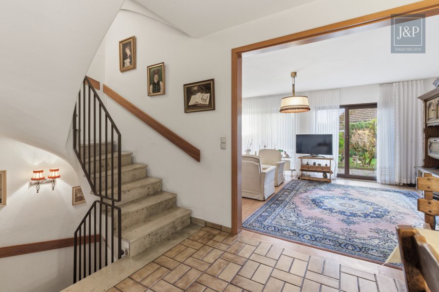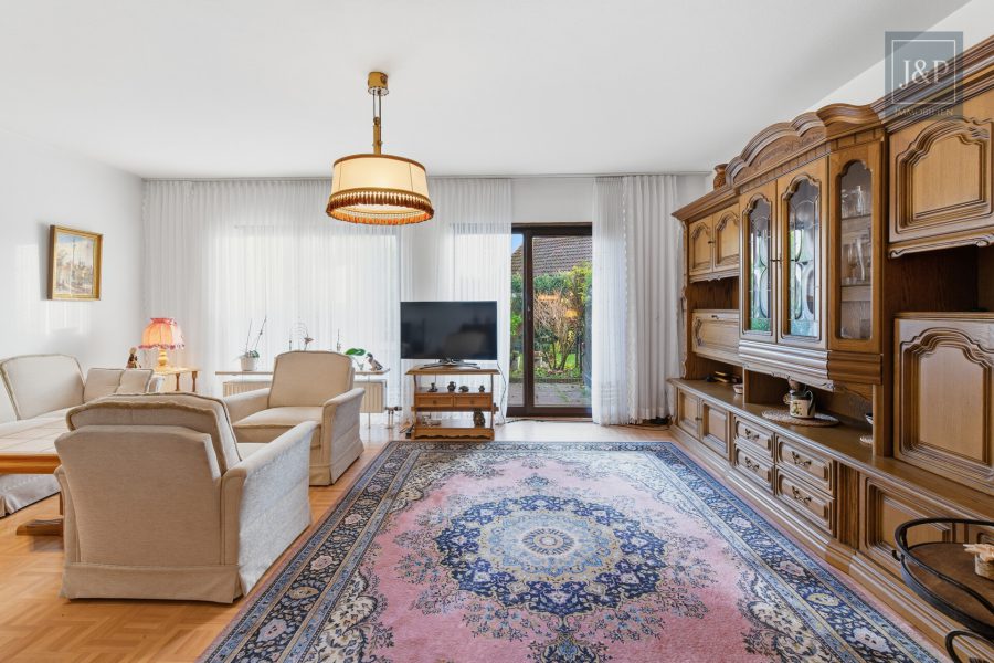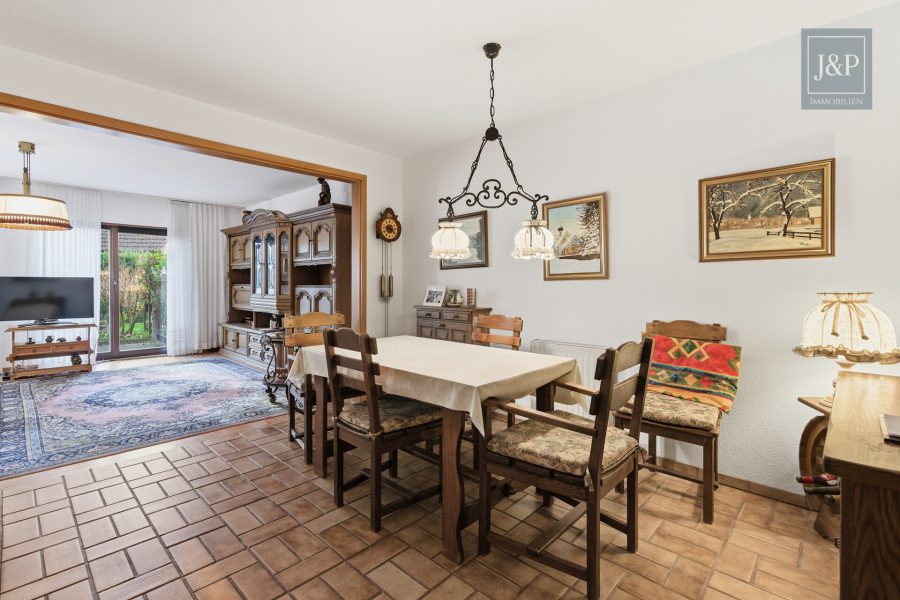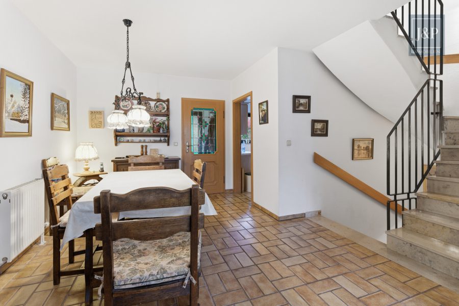 Der lichtdurchflutete Wohn- und Essbereich bildet das Herzstück des Hauses. Große Fensterflächen, der Blick in den gepflegten Garten und die luftige Raumwirkung sorgen für ein warmes, harmonisches Wohnambiente. Ein Gäste-WC ergänzt das Erdgeschoss auf praktische Weise.
