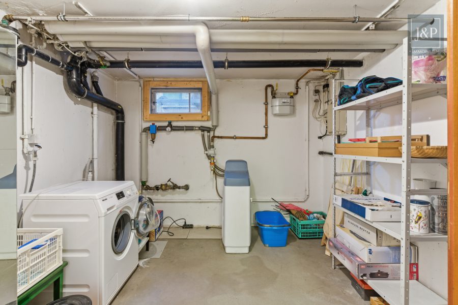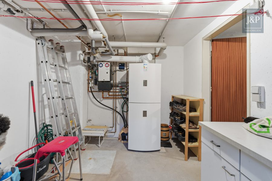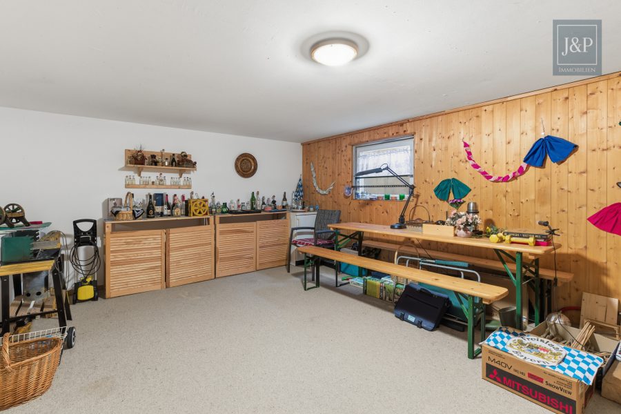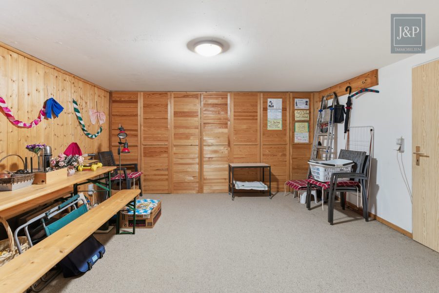 Der teilweise ausgebaute Keller bietet wertvollen Zusatzraum. Ein großer Raum mit Einbauschränken, ehemals als Sommer-Schlafzimmer genutzt, eignet sich ideal als Hobbyraum, Fitnessbereich oder Gästezimmer und fügt sich stimmig in das vielseitige Raumkonzept des Hauses ein.