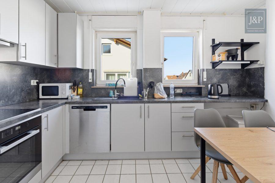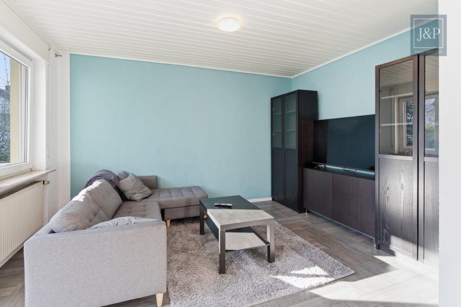 Im Erdgeschoss befindet sich eine gut geschnittene 2-Zimmer-Wohnung mit direktem Zugang zur großzügigen Terrasse und dem Garten. Gerade dieser Bereich wird schnell zum Lebensmittelpunkt: Kinder spielen im Garten, während man selbst entspannt auf der Terrasse sitzt oder den Tag gemeinsam ausklingen lässt. Der vorhandene Kamin im Wohnbereich unterstreicht dabei die wohnliche Atmosphäre zusätzlich.