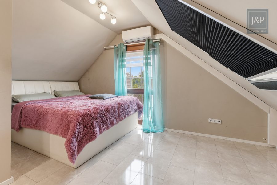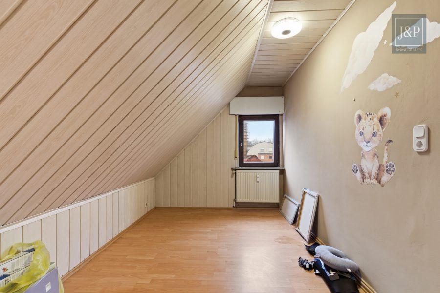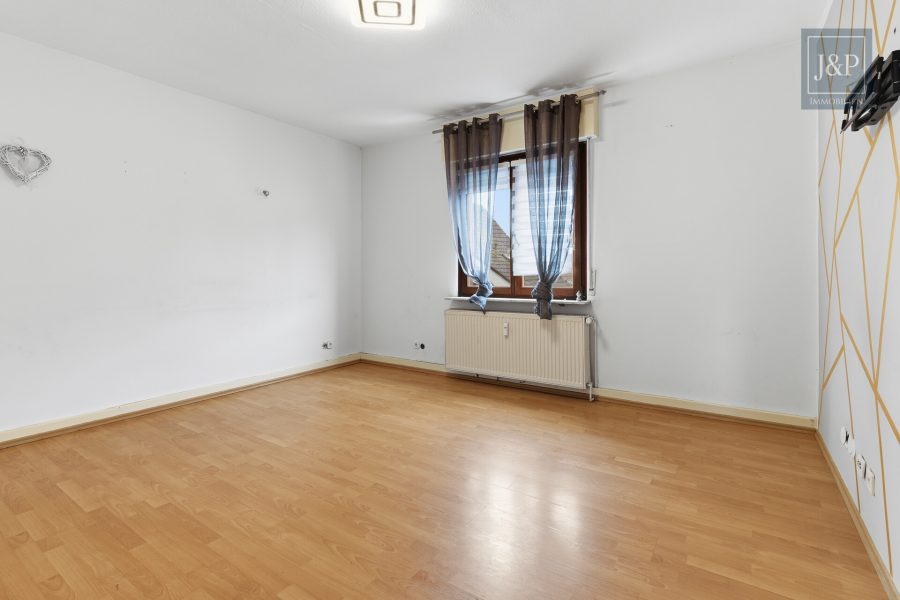 Hier im Obergeschoss stehen zwei große Zimmer zur Verfügung, die viele Nutzungsmöglichkeiten bieten: Wohnen, Schlafen, Arbeiten oder Hobby. Ein zusätzliches kleineres Zimmer mit direktem Badzugang eignet sich perfekt als Kinderzimmer oder Büro. Eine moderne, gepflegte Küche komplettiert die Etage.