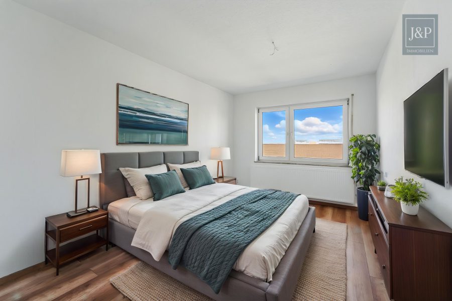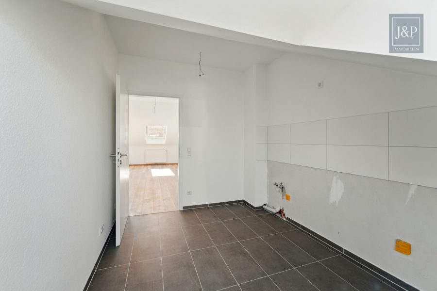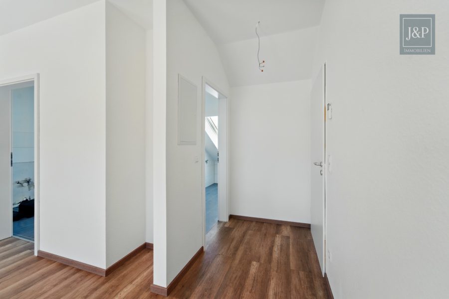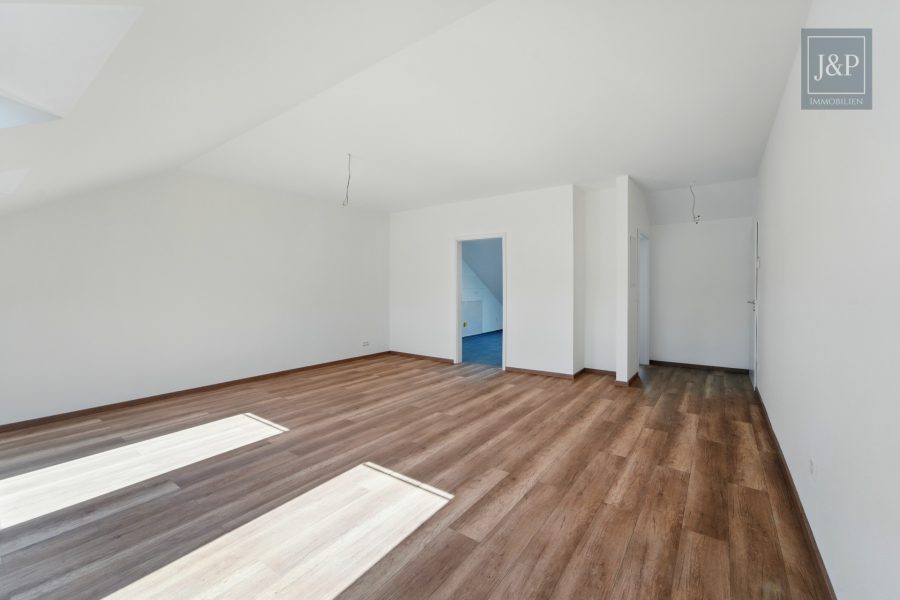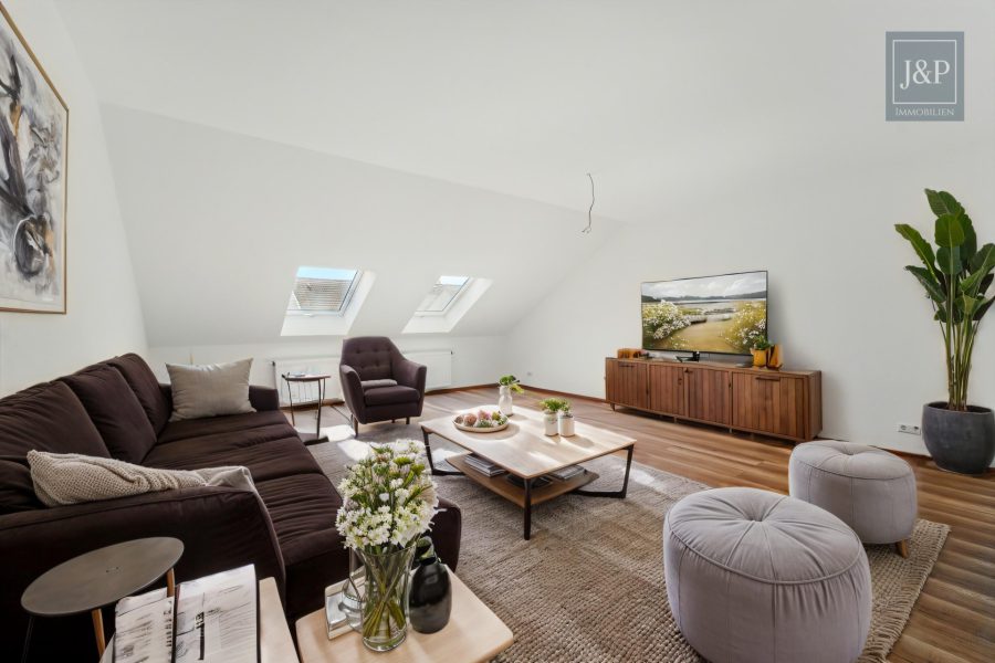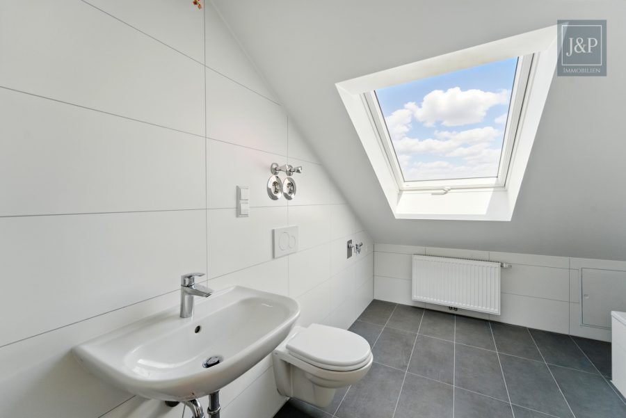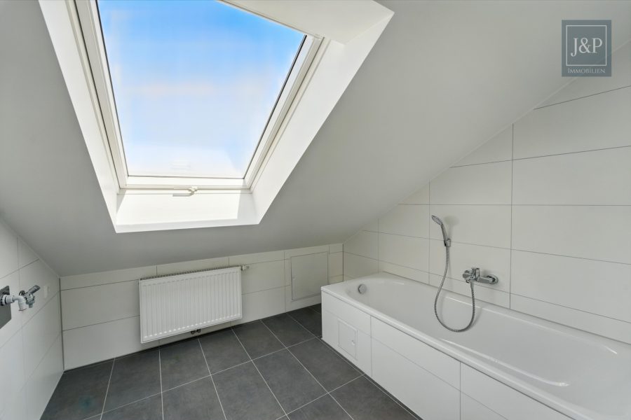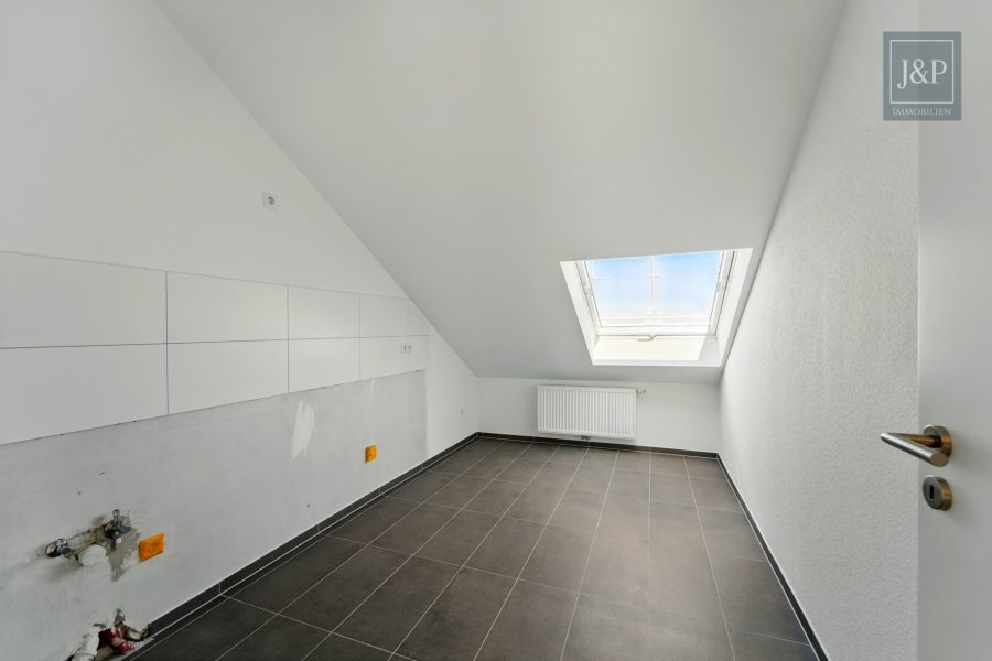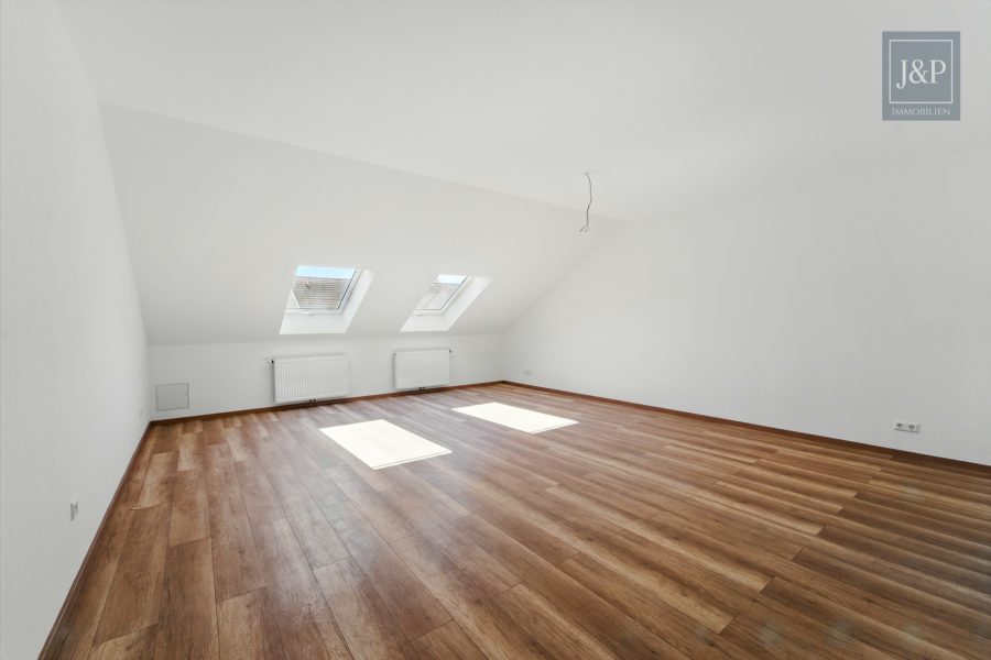 Im Dachgeschoss befindet sich die zweite Wohneinheit mit ca. 55 m². Sie ist als großzügige Einzimmerwohnung mit separater Küche und Tageslichtbad konzipiert – ideal für Singles, Berufspendler oder zur kurzfristigen Vermietung. Die Dachfenster schaffen eine helle und freundliche Atmosphäre.