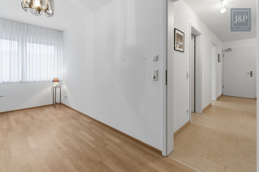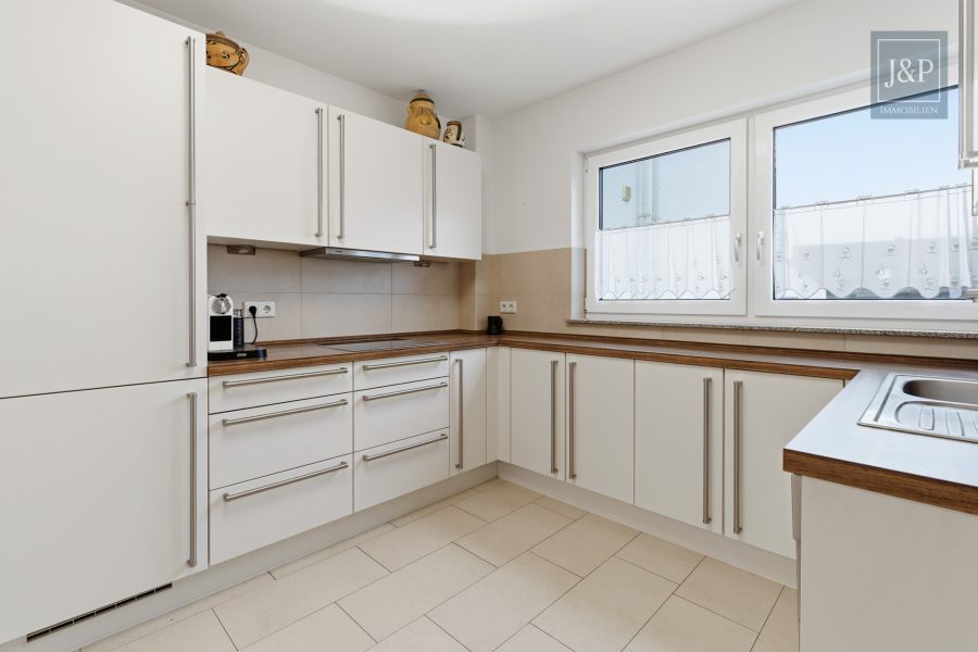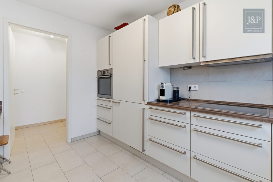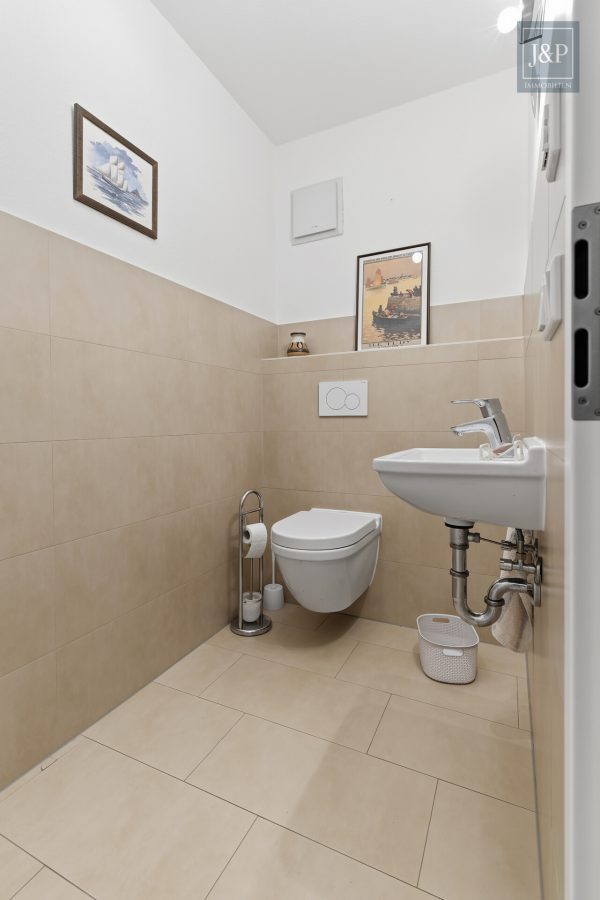 Die Küche ist praktisch geschnitten und verfügt über einen angrenzenden Hauswirtschaftsraum/Abstellkammer, der zusätzlichen Stauraum bietet und den Wohnkomfort spürbar erhöht. Das Badezimmer wird durch ein separates Gäste-WC ergänzt und unterstreicht den funktionalen Anspruch der Wohnung.