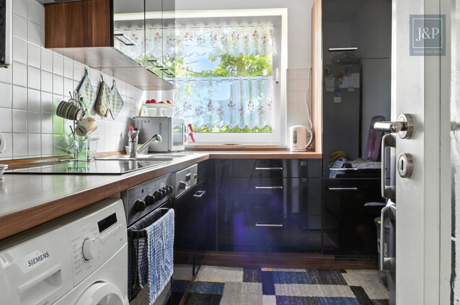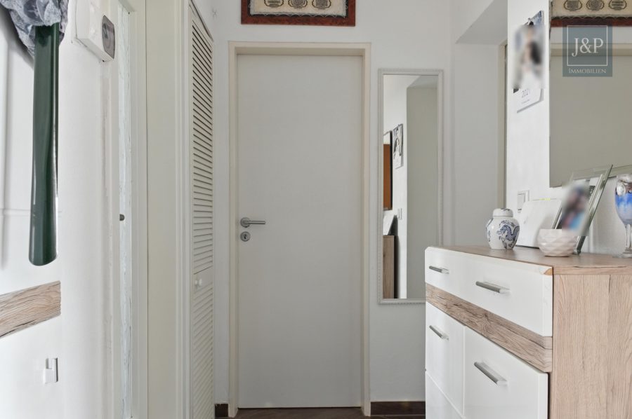 Die Wohnung überzeugt mit einem durchdachten Grundriss: Vom zentral gelegenen Flur sind alle Räume direkt erreichbar. Der helle Wohnbereich mit Zugang zum Balkon schafft ein angenehmes Wohngefühl – durch die Südwest-Ausrichtung genießen Sie hier viele Sonnenstunden. Die angrenzende Küche ist mit einer Einbauküche ausgestattet, die im Objekt verbleibt.