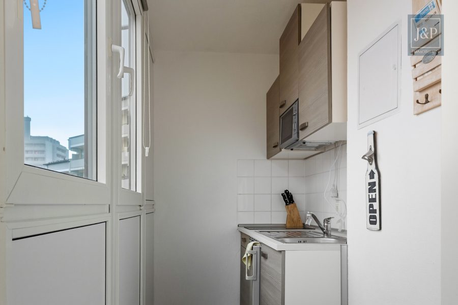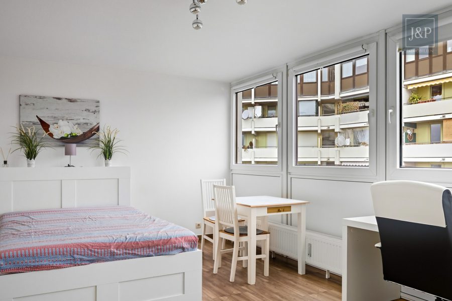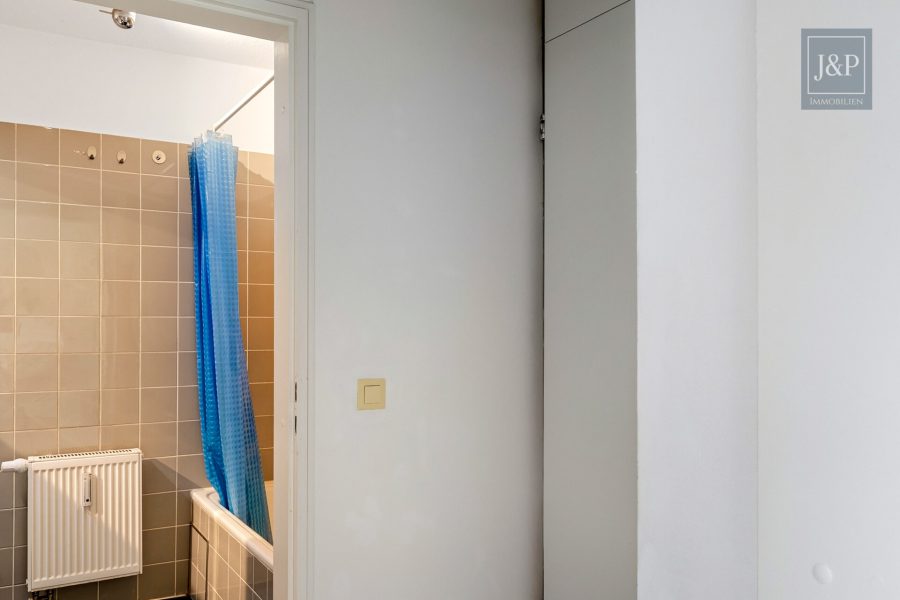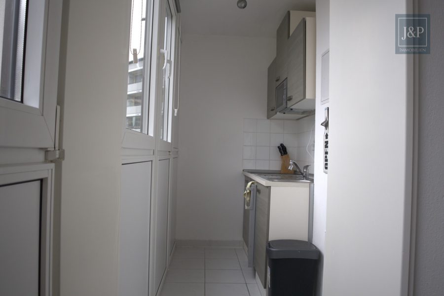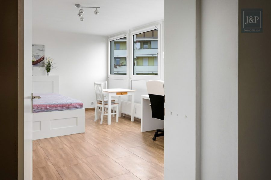 Die Wohnung ist bereits mit hilfreichen Möbelstücken ausgestattet – darunter ein Bett, ein Schrank sowie ein Tisch mit Stühlen. Diese können auf Wunsch ohne Aufpreis übernommen werden und erleichtern den direkten Einzug. Die separate Küche verfügt über ein Fenster und bietet optimale Voraussetzungen zum Kochen und Arbeiten. Ein geräumiges Badezimmer mit Duschbadewanne rundet den angenehmen Wohnkomfort ab.