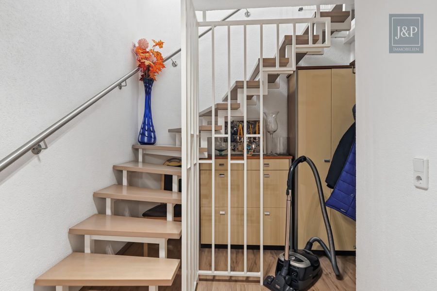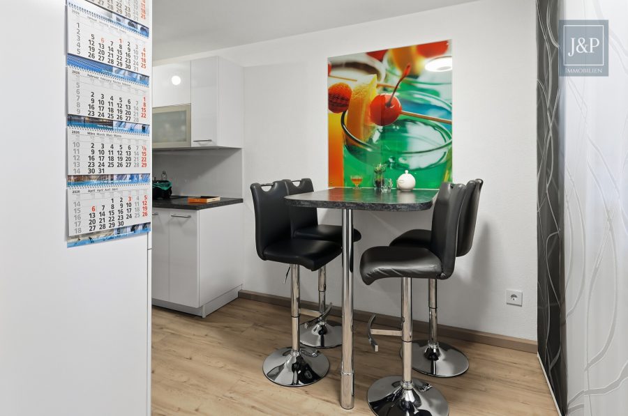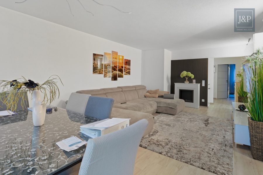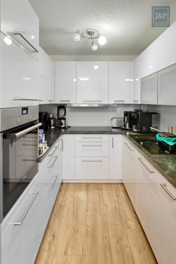 Das Objekt selbst präsentiert sich in einem hervorragenden Zustand, da es erst im Jahr 2016 einer umfassenden Kernsanierung und Modernisierung unterzogen wurde. Schon beim Betreten der Wohnung empfängt Sie ein heller Flur mit maßgefertigten Einbauschränken, die für eine strukturierte Garderobe sorgen. Das Herzstück der unteren Ebene ist das großzügige Wohnzimmer, das mit einem modernen Vinylboden ausgestattet ist. Ein stilvoller Kamin sorgt hier an kühleren Tagen für behagliche Wärme und eine besondere Wohlfühlatmosphäre. Direkt angrenzend befindet sich die hochwertige, separate Einbauküche aus dem Jahr 2016. Mit ihren weißen Hochglanzfronten, einer funktionalen U-Form und einer integrierten Frühstückstheke lässt sie keine Wünsche offen und ist bereits im Kaufpreis enthalten.