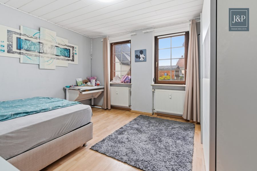 Im Erdgeschoss des Haupthauses stehen zwei große Zimmer zur Verfügung, die aktuell als Kinderzimmer genutzt werden. Die Raumaufteilung erlaubt jedoch ebenso gut die Nutzung als Elternschlafzimmer und Kinderzimmer oder als zwei gleichwertige Schlafräume. In Kombination mit den weiteren Zimmern im Anbau lässt sich die Wohnung flexibel an unterschiedliche Lebensphasen anpassen – vom gemeinsamen Wohnen mit kleinen Kindern bis hin zu mehr Rückzug und Privatsphäre, wenn der Platzbedarf wächst.