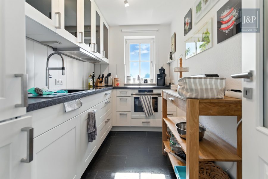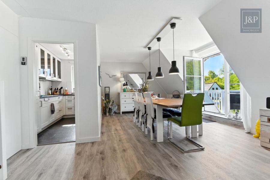 Der offene, sowie großzügige Wohn- und Essbereich stellt den perfekten Schauplatz für gesellige Abende oder auch entspannte Stunden allein dar. Große Fensterfronten lassen viel Tageslicht herein und garantieren ein behagliches Wohngefühl, während sich der Zugang zu zwei traumhaften Balkonen bietet. Hier können Sie die warmen Sonnenstrahlen und den erfrischenden Nordseewind in vollen Zügen genießen.