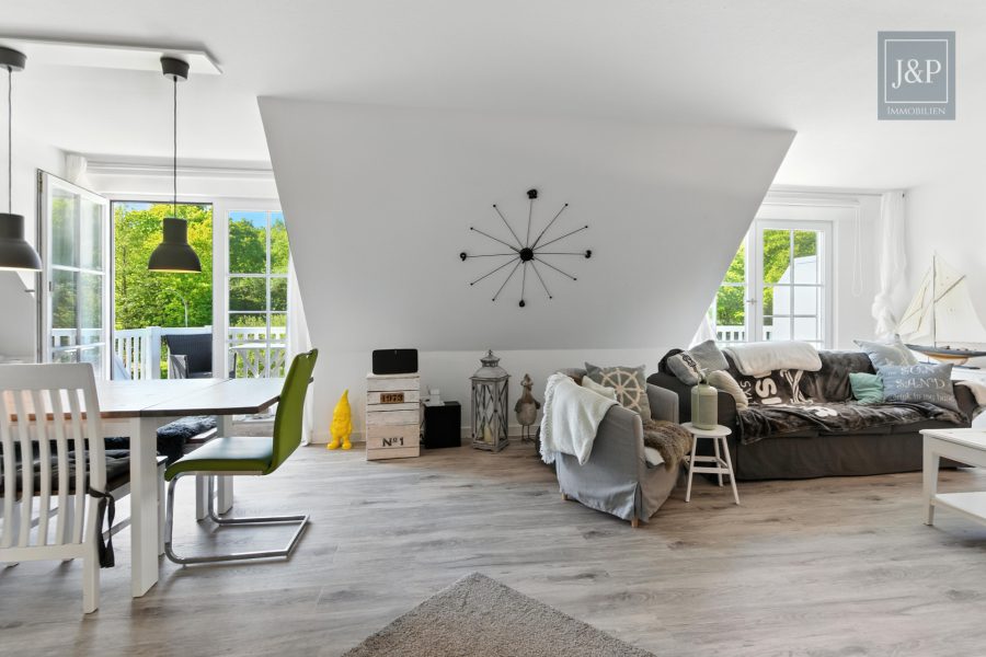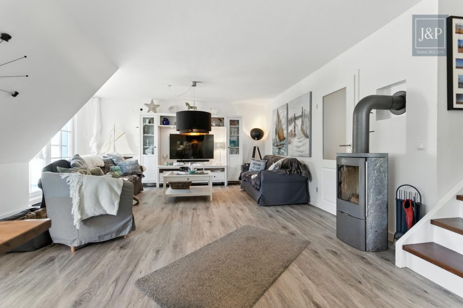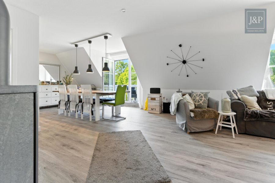 Der offene, sowie großzügige Wohn- und Essbereich stellt den perfekten Schauplatz für gesellige Abende oder auch entspannte Stunden allein dar. Große Fensterfronten lassen viel Tageslicht herein und garantieren ein behagliches Wohngefühl, während sich der Zugang zu zwei traumhaften Balkonen bietet. Hier können Sie die warmen Sonnenstrahlen und den erfrischenden Nordseewind in vollen Zügen genießen.