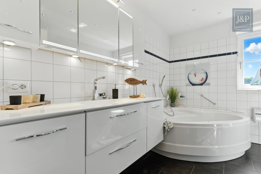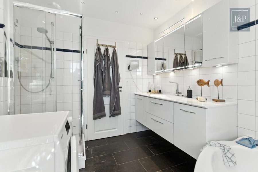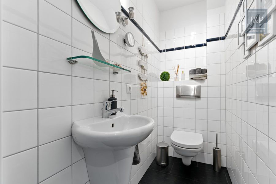 Der maritime, elegante Badezimmerbereich bietet ein voll ausgestattetes Bad für entspannende Wohlfühlmomente. Mit einem zusätzlichen Gäste-WC gewährleistet die Wohnung komfortable Privatsphäre für Ihre Gäste.