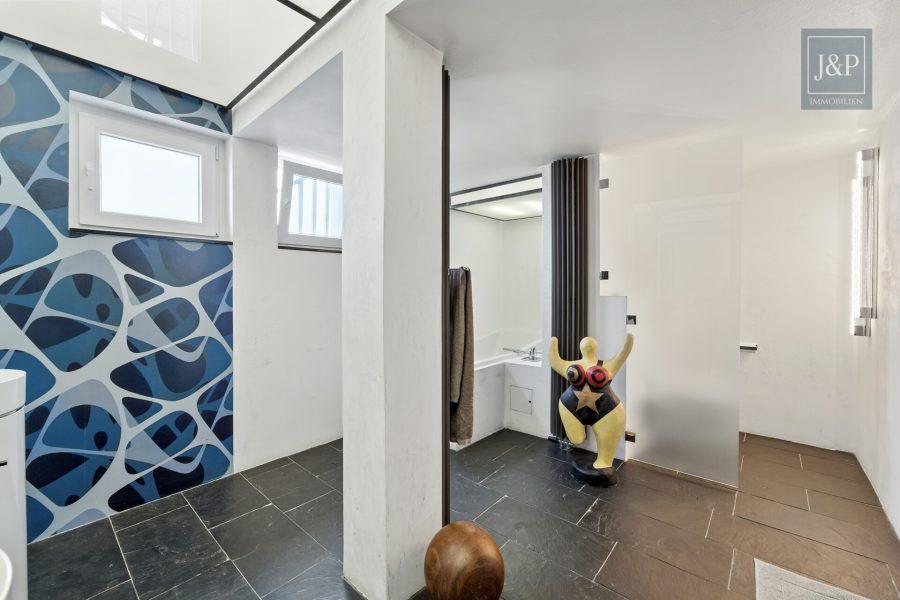 Das Badezimmer ist ein weiteres Highlight: Zwei elegante Waschbecken, eine große Badewanne sowie eine separate Dusche vereinen Design mit Funktionalität. Selbst die Heizkörper sind als exklusive Designstücke gestaltet.